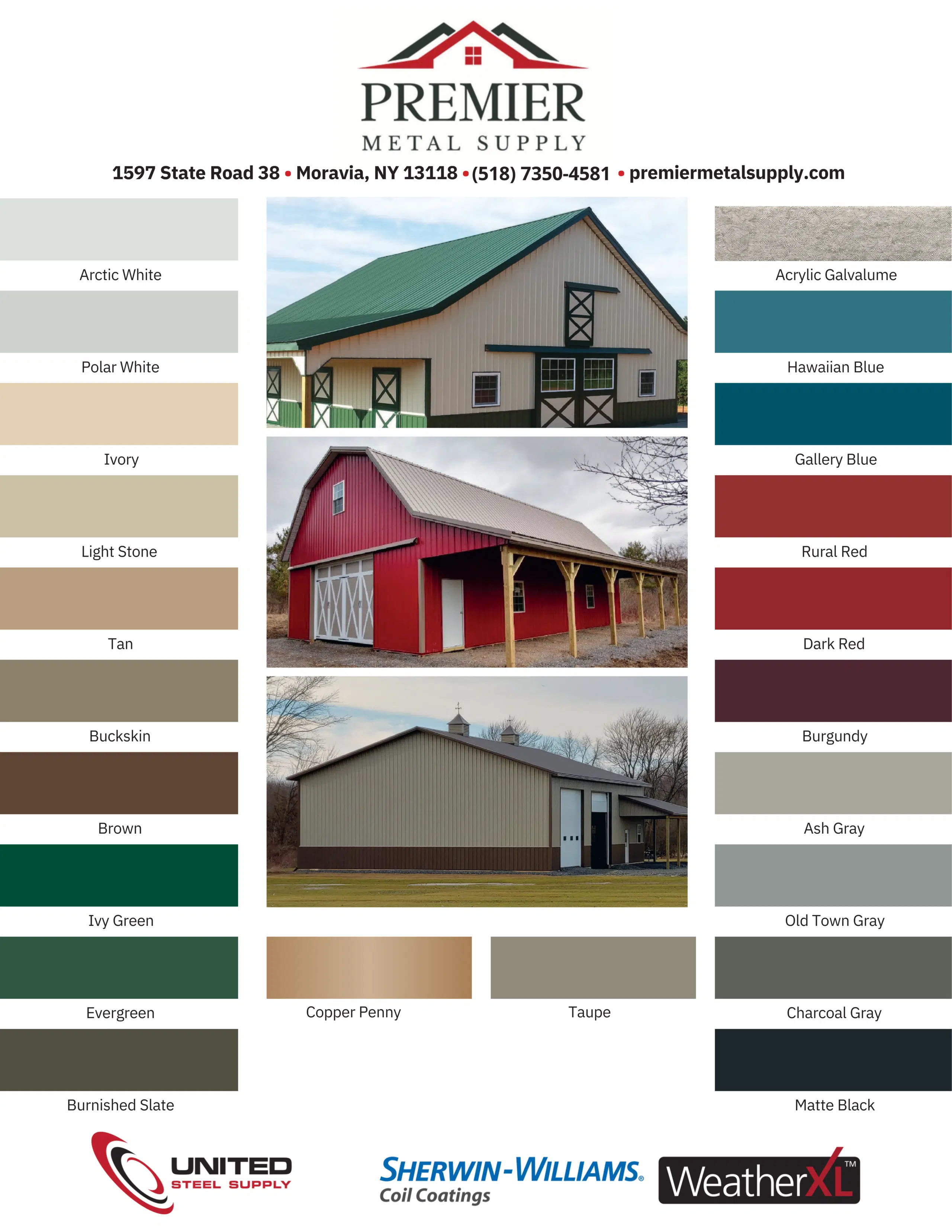 Looking for inspiration for your next construction or renovation project? Our comprehensive color chart showcases an array of vibrant and durable metal finishes, from Arctic White to Burnished Slate Crinkle. Download the brochure to explore options that suit your aesthetic and structural needs. Premier Metal Supply is your trusted partner for quality and reliability in metal supplies.